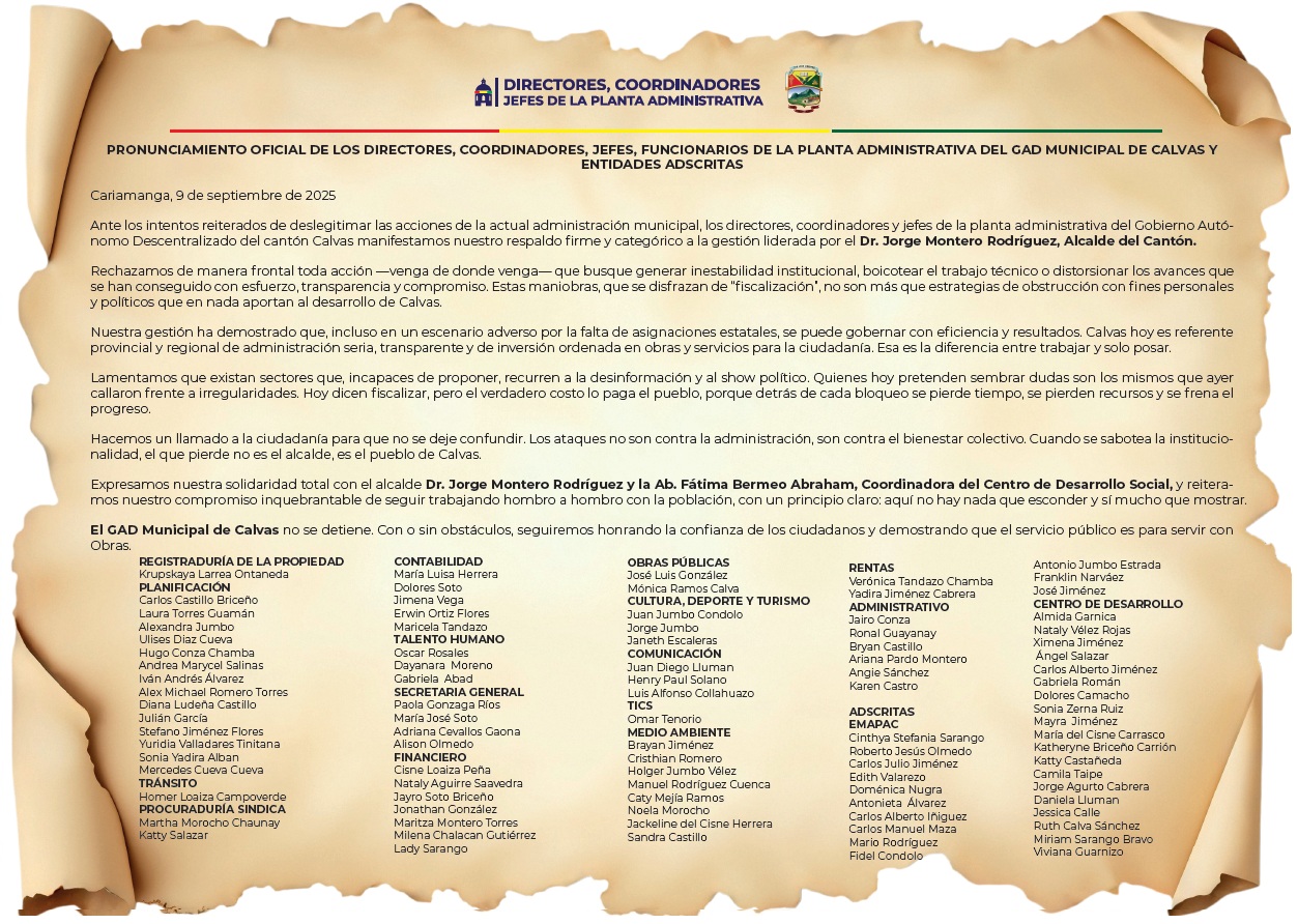 PRONUNCIAMIENTO OFICIAL DE LOS DIRECTORES, COORDINADORES, JEFES Y FUNCIONARIOS DE LA PLANTA ADMINISTRATIVA DEL GAD MUNICIPAL DE CALVAS Y ENTIDADES ADSCRITAS.